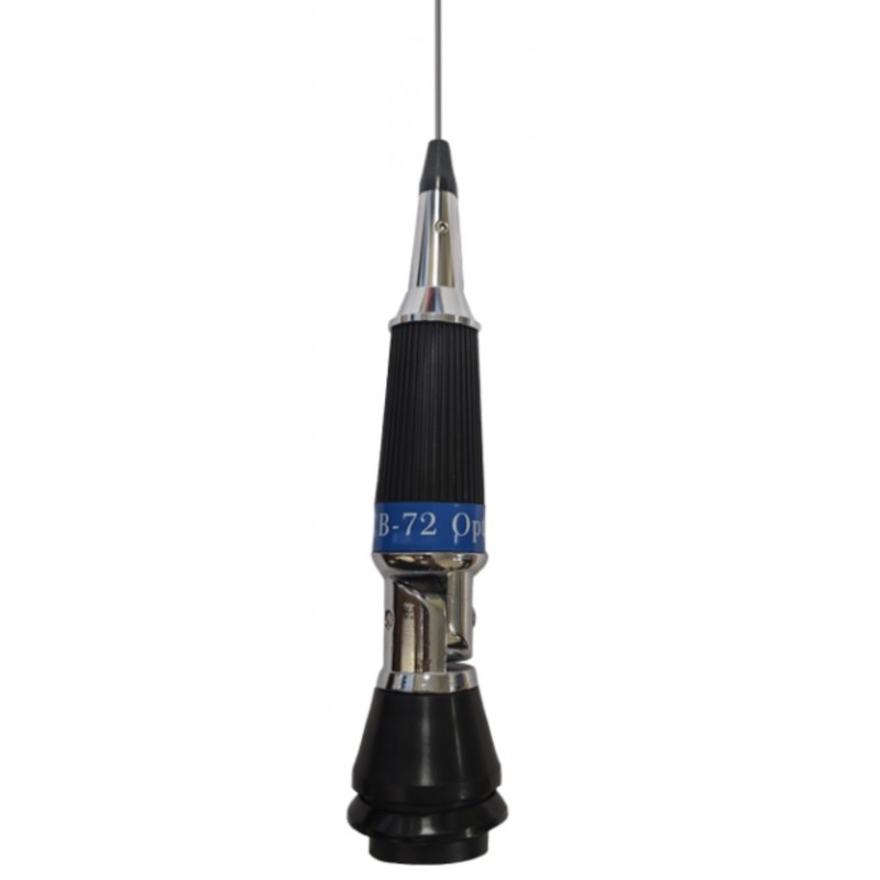 Optim CB-72 автомобильная антенна с врезным основанием для работы на частотах 27 МГц. У основания антенны расположен поворотный механизм, который позволяет выставить нужный угол наклона.