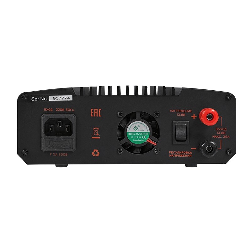 Racio Power RS30SD регулируемый импульсный блок питания для электропитания постоянным током различной теле-коммуникационной аппаратуры, аппаратуры КВ и УКВ радиосвязи мощностью до 90Вт, систем охранно-пожарной сигнализации и видеонаблюдения, систем телеметрии и автоматики, а также иной радиоэлектронной аппаратуры с током нагрузки до 30А. Двухстрочный ЖК дисплей с подсветкой, выбор уровня выходного напряжения (постоянное или регулируемое), возможность регулирования уровня импульсных помех, три блока клемм подключения нагрузки с максимальным током до 3А, до 10А, до 30А, защита от КЗ, защита переполюсовки, защита от превышения уровня выходного напряжения.