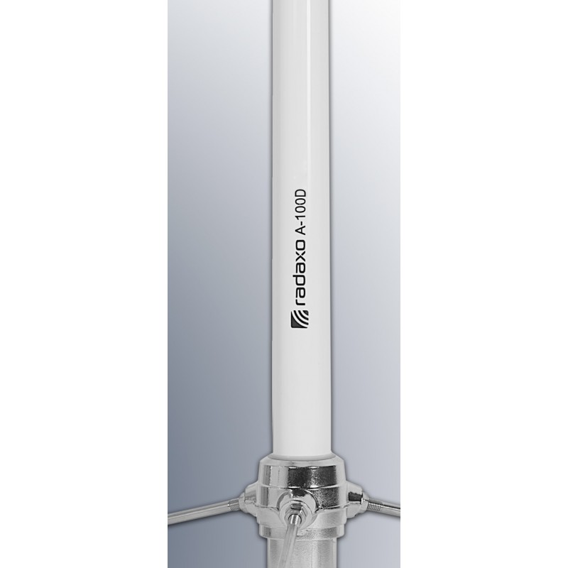 Вертикальная базовая антенна Radaxo A-100D имеет прочную конструкцию из высокопрочного усиленного фибергласса с перекрестной намоткой в три слоя (FRP), обеспечивающего устойчивость к механическим повреждениям и внешним факторам окружающей среды. Конструкция антенны прочная и обеспечивает длительный срок службы даже в суровых погодных условиях. Крепеж из дюралюминия обеспечивает дополнительную устойчивость к коррозии, что делает антенну высоконадежной и долговечной. Антенна Radaxo A-100D разработана для работы в условиях сильных ветровых нагрузок, что делает её пригодной для использования в суровых погодных условиях. Конструктивно антенна Radaxo A-100D представляет вертикал с волновым элементом 1/2 длины волны.