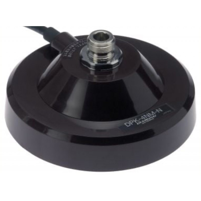 Diamond DPK-4NM-N магнитное основание, имеющее диаметр 111 мм и разъем подключения антенны N-гнездо. Магнитное основание Diamond DPK-4NM-N имеет предустановленный кабель 3.5D-LFVV длиной 4 метра. Кабель очень гибкий, что облегчает аккуратную установку в автомобиле. На кабеле установлен разъем N-штекер, что обеспечивает совместимость с различными типами радиооборудования, низкие потери и водозащиту. Магнитное основание Diamond DPK-4NM-N устанавливается на металлические части автомобиля - крыша, капот, багажник. В комплект магнитного крепления входит защитная прокладка для улучшения сцепления и защиты от царапин на лакокрасочном покрытии автомобиля. Магнитное основание необходимо устанавливать на достаточно ровную металлическую поверхность, что обеспечит надежную и устойчивую емкостную связь с корпусом автомобиля. Оптимальное расположение магнитного основания по центру крыши автомобиля. Для установки на магнитное основание рекомендуются автомобильные антенны длиной до 1.2 метра и весом до 350 грамм. Установка более тяжелых автомобильных антенн или антенн с длиной излучающего штыря более 1.2 метра не рекомендуется для использования во время движения, но использование в неподвижном состоянии или на металлическом подоконнике допустимо.