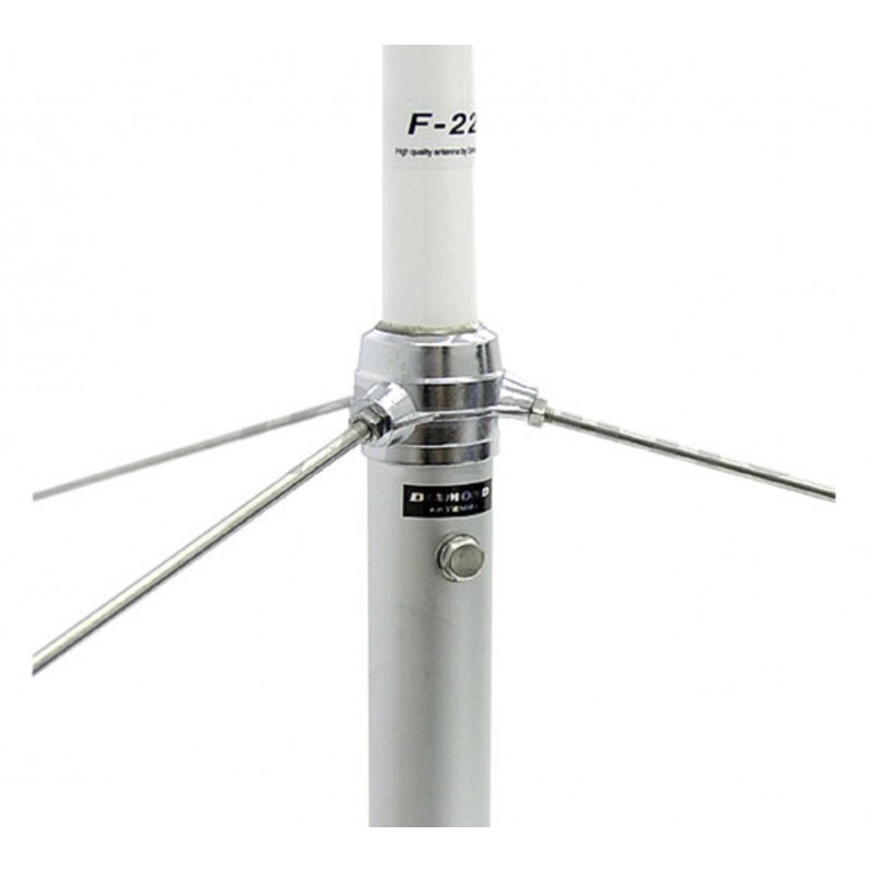 Вертикальная базовая антенна Diamond F22 имеет прочную конструкцию из двух секций армированного стекловолокном пластика (FRP), обеспечивающую устойчивость к механическим повреждениям и внешним факторам окружающей среды. Конструкция антенны прочная, водонепроницаемые соединительные муфты защищают от влаги, обеспечивая длительный срок службы даже в суровых погодных условиях. Основание антенны из алюминия с покрытием, радиальные элементы из нержавеющей стали. Крепеж из нержавеющей стали обеспечивает дополнительную устойчивость к коррозии, что делает антенну высоконадежной и долговечной. Антенна Diamond F22 разработана для работы в условиях сильных ветровых нагрузок, что делает её пригодной для использования в суровых погодных условиях. Конструктивно антенна Diamond F22 представляет вертикал с двумя волновыми элементами по 7/8 длины волны.