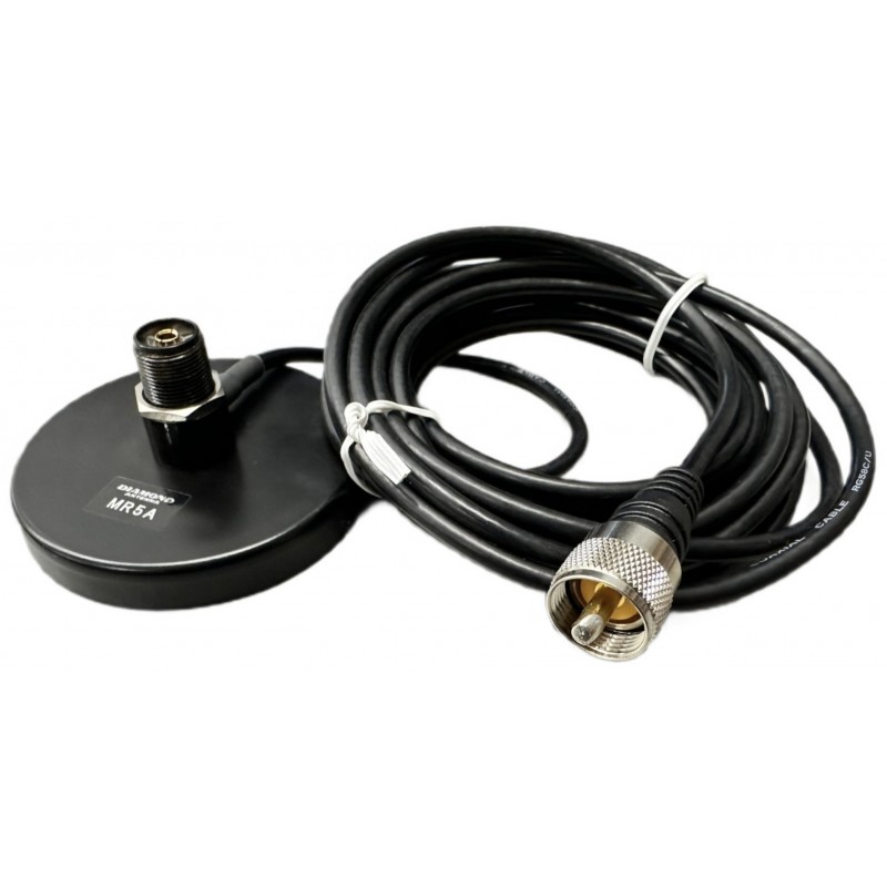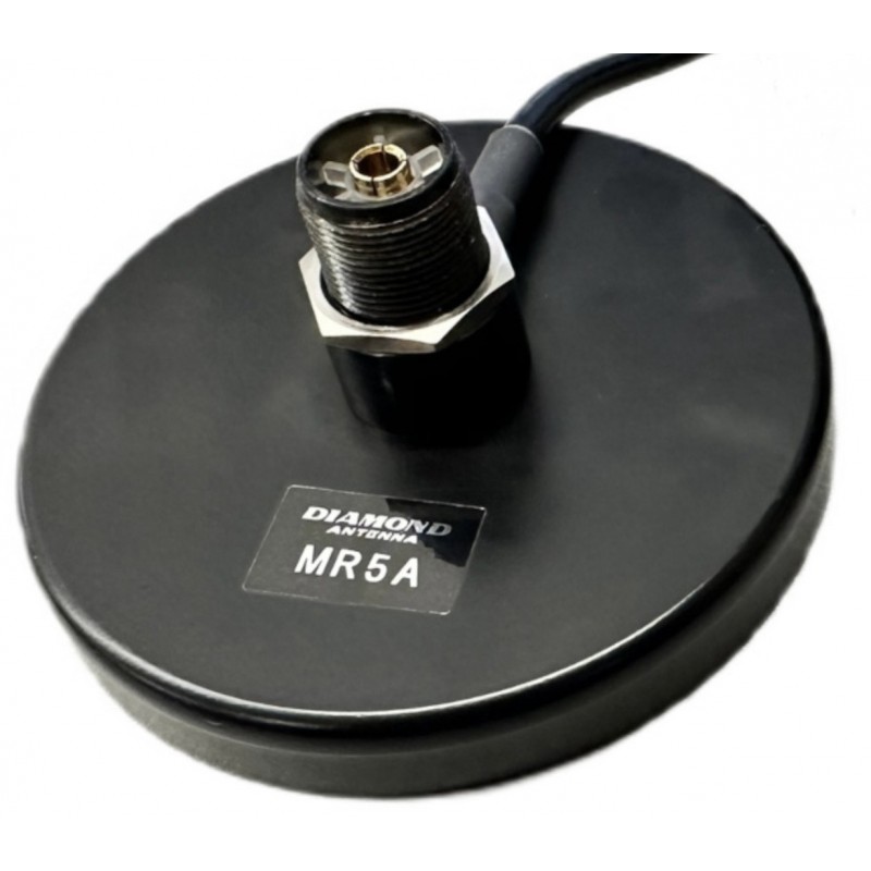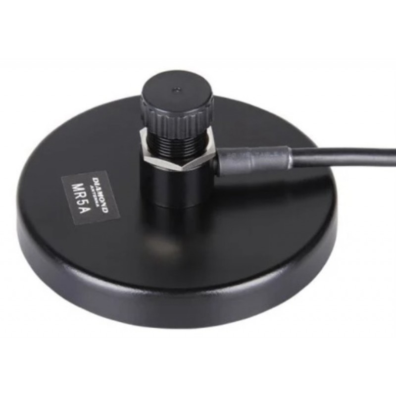 Diamond MR5A магнитное основание, имеющее диаметр 87 мм. Разъем подключения антенны SO239 (PL-гнездо), который при снятии автомобильной антенны закрывается резьбовым защитным пластиковым колпачком. Магнитное основание Diamond MR5A имеет предустановленный кабель RG-58 A/U длиной 5 метров. Кабель очень гибкий, что облегчает аккуратную установку в автомобиле. На кабеле установлен разъем PL-259, что обеспечивает совместимость с различными типами радиооборудования - радиостанциями, усилителями и тд. Магнитное основание Diamond MR5A устанавливается на металлические части автомобиля - крыша, капот, багажник. В комплект магнитного крепления входит защитная прокладка для улучшения сцепления и защиты от царапин на лакокрасочном покрытии автомобиля. Магнитное основание необходимо устанавливать на достаточно ровную металлическую поверхность, что обеспечит надежную и устойчивую емкостную связь с корпусом автомобиля. Оптимальное расположение магнитного основания по центру крыши автомобиля. Для установки на магнитное основание рекомендуются автомобильные антенны длиной до 1 метра и весом менее 150 грамм. Установка тяжелых антенн, а также автомобильных антенн с длиной излучающего штыря более 1 метра не рекомендуется для использования во время движения, но использование в неподвижном состоянии или на металлическом подоконнике допустимо. Установка на магнитное основание Diamond MR5A и использование во время движения популярных автомобильных антенн Diamond NR-770, которые имеют длину около 100 см не рекомендуется.